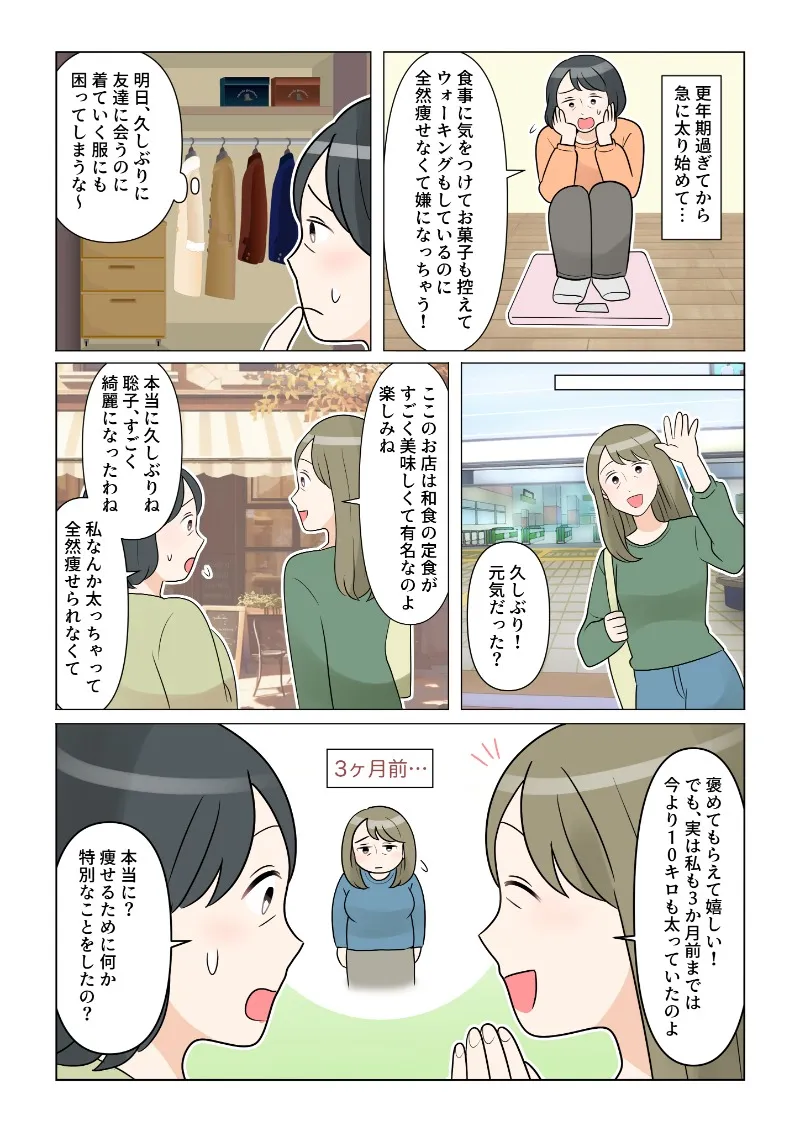 弘美「更年期過ぎてから急に太り始めて…食事に気をつけて、お菓子も控えて、ウォーキングもしているのに全然痩せなくて嫌になっちゃう!」