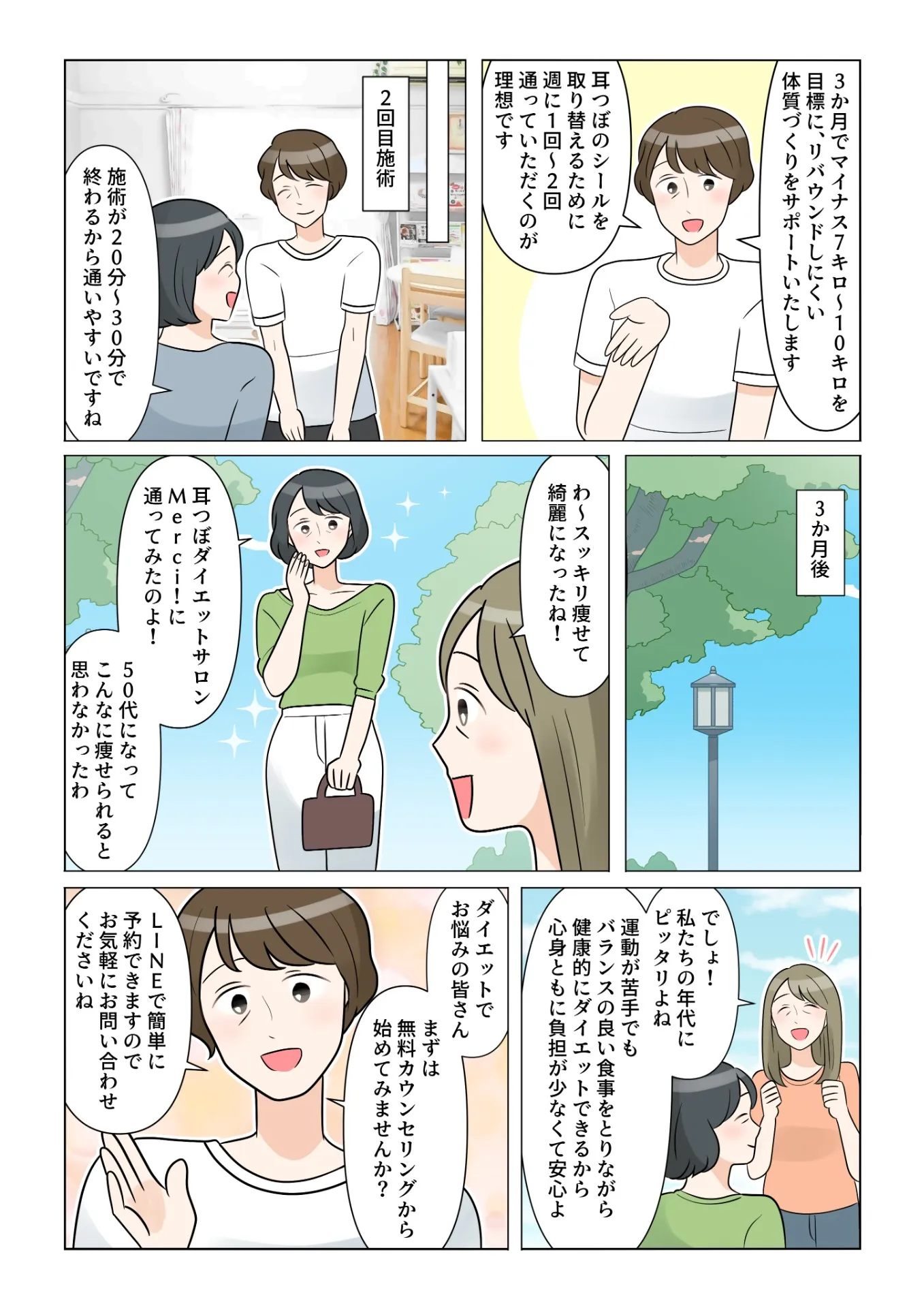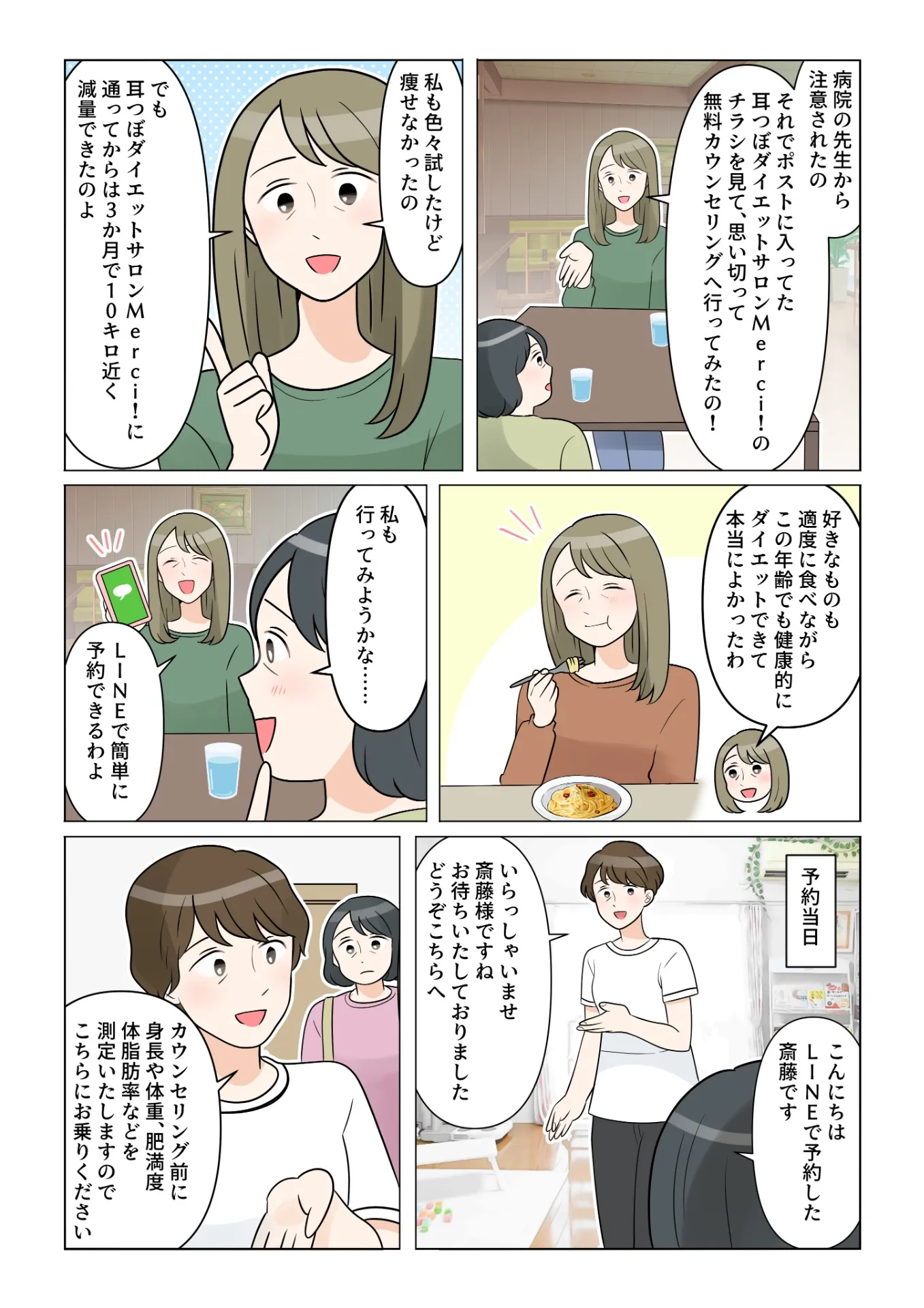 聡子「病院の先生から注意されたの。それでポストに入ってた耳つぼダイエットサロンMerci!のチラシを見て、思い切って無料カウンセリングへ行ってみたの!」
