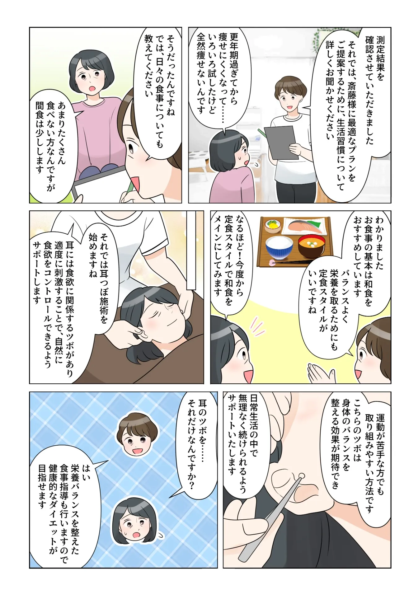 代表「それでは耳つぼ施術を始めますね。耳には食欲に関係するツボがあり、適度に刺激することで、自然に食欲をコントロールできるようサポートします」
